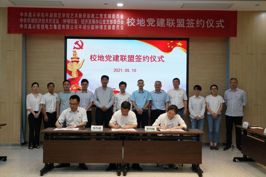 5月10日下午,学院艺术教研部教工党支部、平湖经济技术开发区(钟埭街道)经济发展办公室党支部和嘉兴恒创电力集团有限公司平湖分部钟埭党支部在平湖市供电公司举行“学党史、悟思想、办实事、开新局”共建“善美经开” 三方支部联建签约仪式,以支部联建努力打造共建共享的党建工作新格局。学院党委书记朱素斌、院长李勇、副院长蒋建其,平湖经济技术开发区(钟埭街道)副主任陆丹恩、平湖市供电公司总经理沈红峰等出席签约仪式。