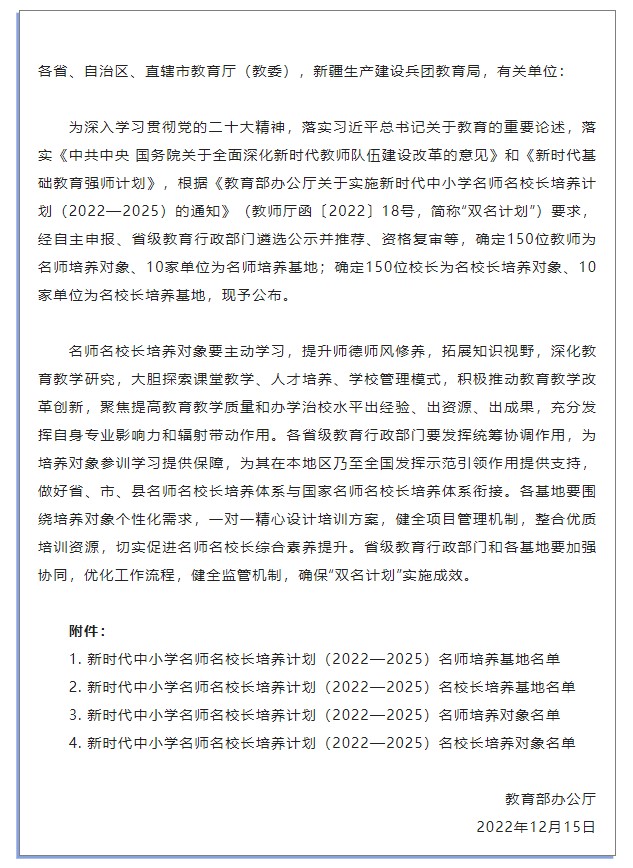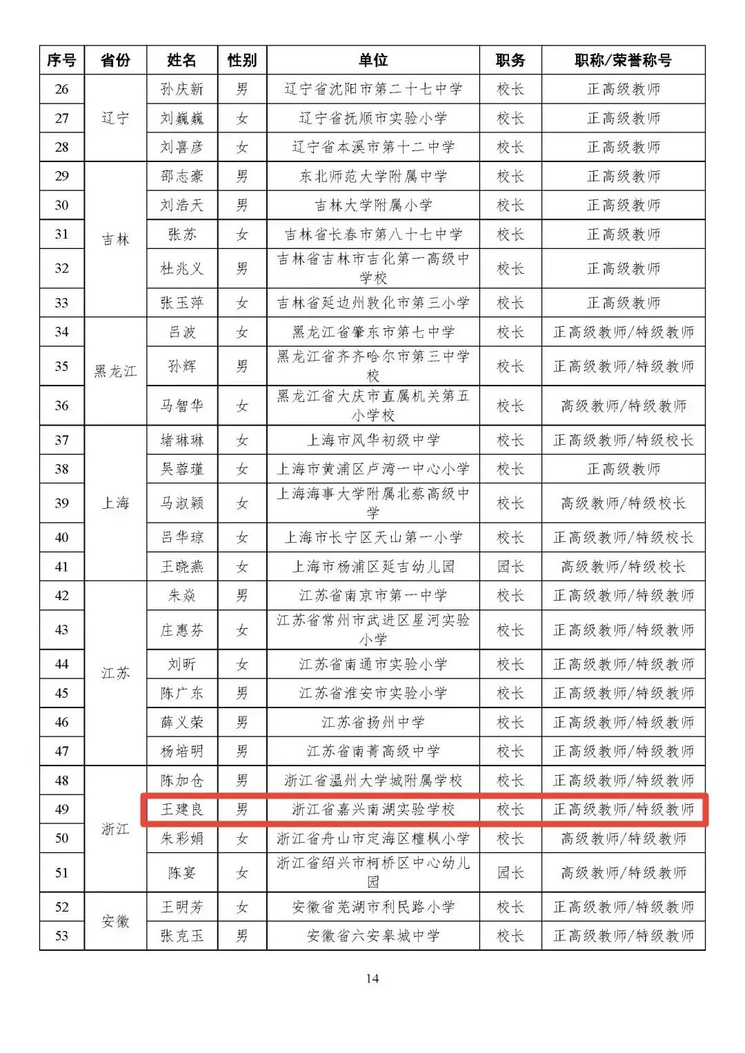 近日,教育部办公厅公布了新时代中小学名师名校长培养计划(2022—2025)培养基地及培养对象名单,确定150位教师为名师培养对象、10家单位为名师培养基地,确定150位校长为名校长培养对象、10家单位为名校长培养基地。校友嘉兴南湖实验学校王建良校长入选新时代中小学名师名校长培养计划!嘉兴唯一!