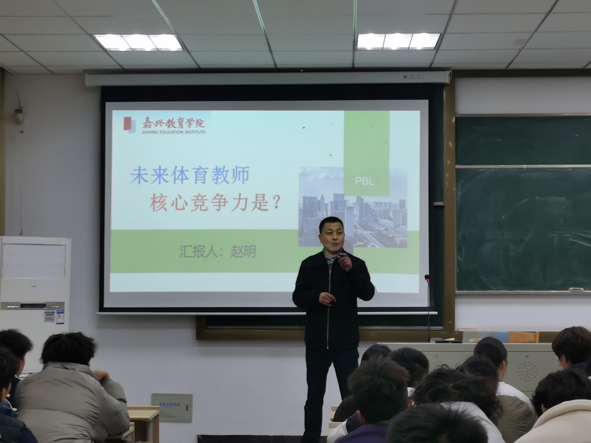 12月6日,嘉兴市教研员赵明应邀来学院为体育教育系全体师生作“体育教育教师核心素养的构建——从嘉兴市青年教师教学技能大赛说起”专题讲座。讲座由学院副院长、体育教育系主任朱小烽主持。
