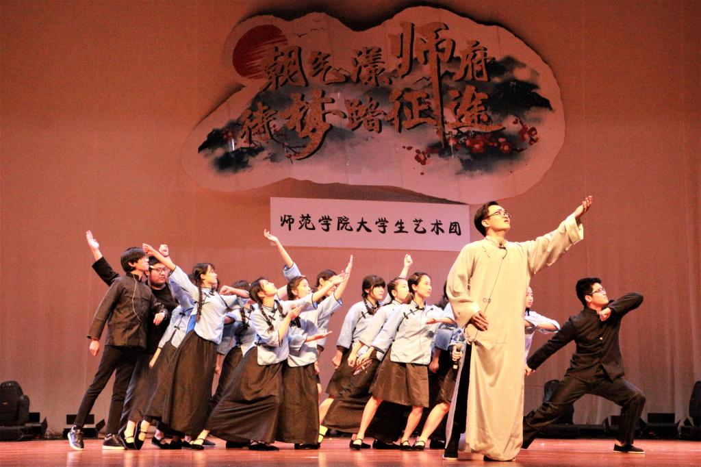 晚会在大学生艺术团自编自导自演的话剧《永远的钟声》首演中推向高潮。话剧以歌舞结合的独特表现形式,带观众回到平湖师范前身——省立二中在抗战爆发时,校长张印通先生带着120余名学生辗转迁徙,矢志不移、坚守办学的艰难岁月。演员们的表演让在场的同学们感受到了昔日学子们不畏艰险、坚韧不拔的求学精神,对“学高为师、身正为范”这八个字有了更深刻的理解。