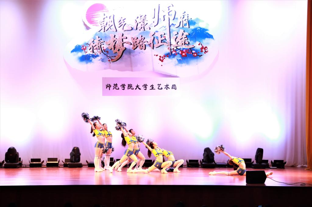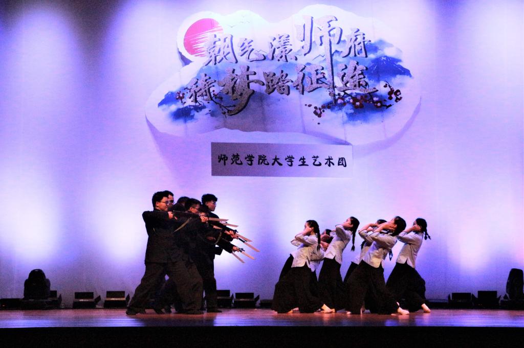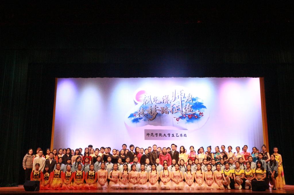 2018年12月23日晚18点,由师范学院团总支、学生会主办,大学生艺术团承办的“朝气漾师府,待梦踏征途”师范学院第三届文化艺术节暨师范生职业技能展演闭幕式、大学生艺术团2018年迎新年晚会于体艺楼隆重举行,近1000名师生共同观看。