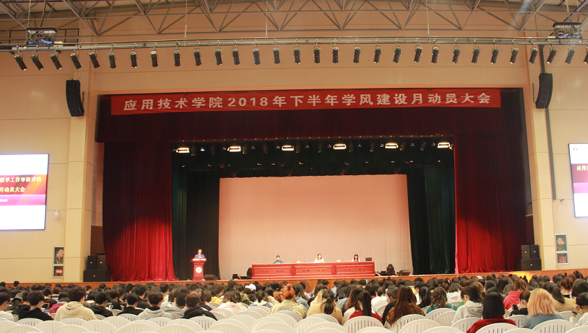 10月18日下午,应用技术学院本科教学工作审核评估暨2018年下半年学风建设月动员大会在体艺楼召开。副院长苏海林、副书记冯伟芳、学生处有关老师、全体辅导员和学院全体学生参加会议。会议由冯伟芳主持。