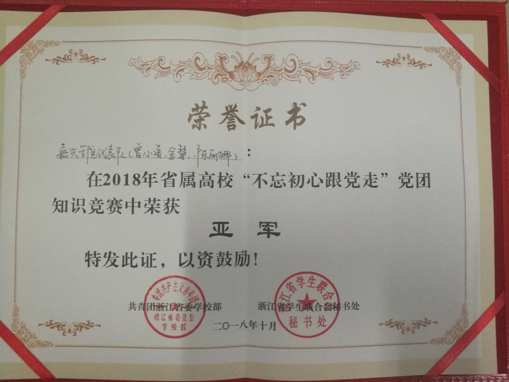 师范学院的陈丽娜、曾心凌、金慧三名同学经过层层选拔代表我校参赛。队员们凭借扎实的理论知识、熟练的答题技巧及良好的心理素质,在实务笔试、现场答题两轮之后以综合排名第五的成绩,成功进入决赛。在最后的巅峰对决赛中默契配合、沉着应战、奋起直追,以综合分数排名第二的好成绩荣获“2018年省属高校‘不忘初心跟党走’党团知识竞赛”亚军。