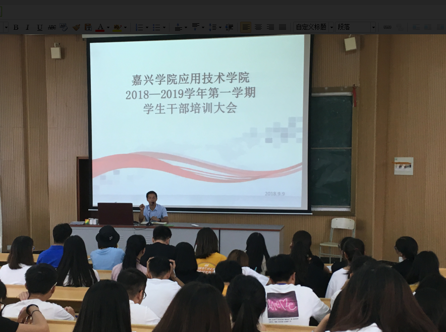 9月9日,学院2018-2019学年第一学期学生干部培训大会在阶梯教室二举行。学院党总支副书记冯伟芳以及学工办的辅导员老师,学院团总支、学生会学生干部、各班班长、团支书参加会议。