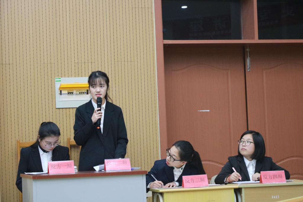 12月26日晚,学院第二届大学生辩论赛决赛于阶梯教室三正式开始。随着观众热烈的掌声,学工办主任卓海丹老师、团总支缪婷婷老师作为评委入座。钱瑞琳、唐思晴、魏荧昊、孟轩代表正方观点“辩论重在求真”,潘璨、孔春露、鲁诗曼、陈裴雯代表反方观点“辩论重在求智”。双方握手入座,全场鸦雀无声,一场战争一触即发。