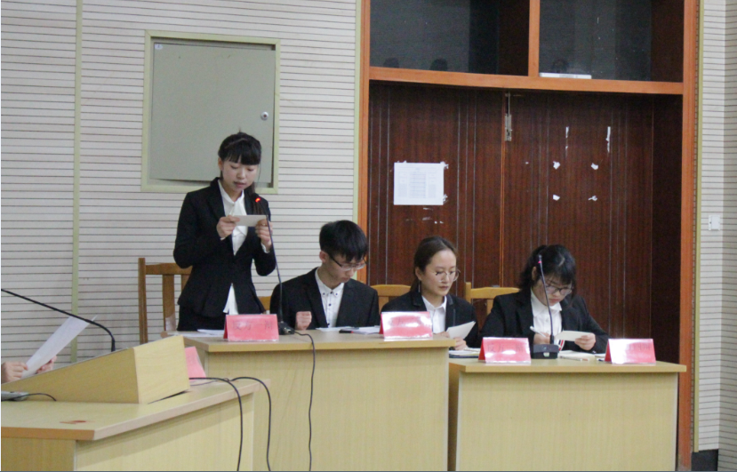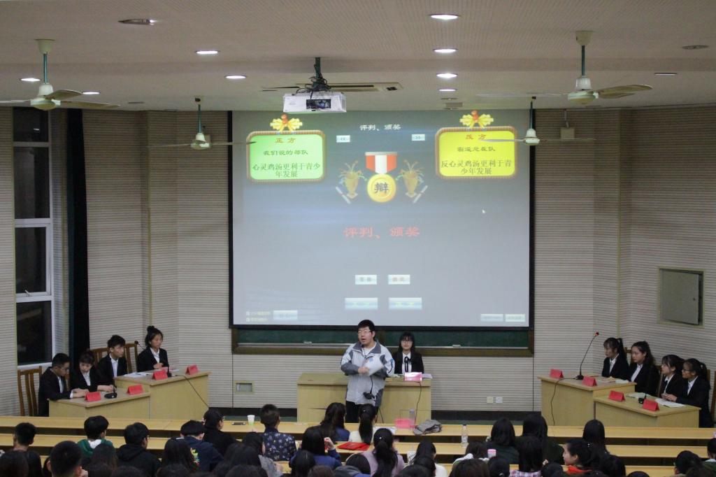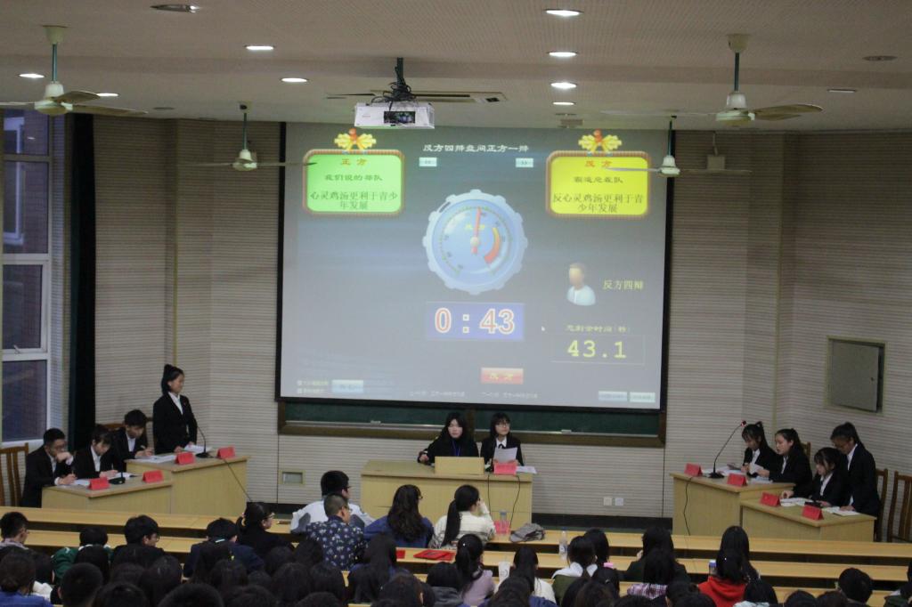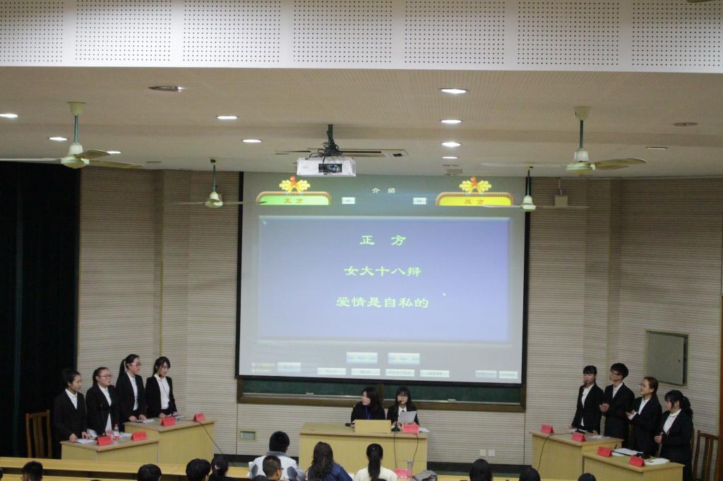4月9日晚,学院辩论赛决赛首轮于阶梯教室一正式开始。伴随着观众热烈的掌声,评委陈力豪、王佳琴、朱玥依次落座。本次比赛有四支队伍,共有两场,分别是我们说的都队和霸道总裁队围绕“心灵鸡汤还是反心灵鸡汤更利于青少年发展”,女大十八辩队和1990队围绕“爱情是自私的还是无私的”辩题展开。