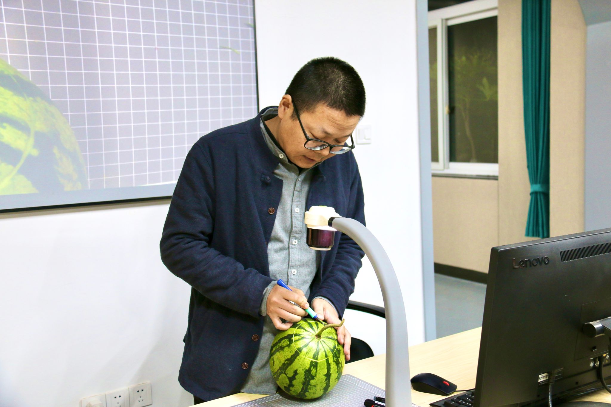 徐仁达和陆加伟详细介绍平湖西瓜灯起源与艺术特点、西瓜灯悠久历史以及西瓜灯成品展示,让学生们更直观地感受西瓜灯的文化气息。陆加伟强调雕刻西瓜的选取,雕刻手法等注意事项,提醒学生们注意安全,并在投影仪下进行操作示范。