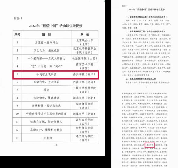 12月16日,教育部关工委下发通知,公布2022年“读懂中国”活动入选作品名单,我院学生作品《不追歌星追科星》入选教育部关工委“读懂中国”活动最佳微视频,成为我省教育厅关工委上报作品中唯一入选的最佳微视频作品,并入选中国教育电视台“读懂中国”活动优秀作品展播。学校获教育部关工委“读懂中国”活动表扬单位。
