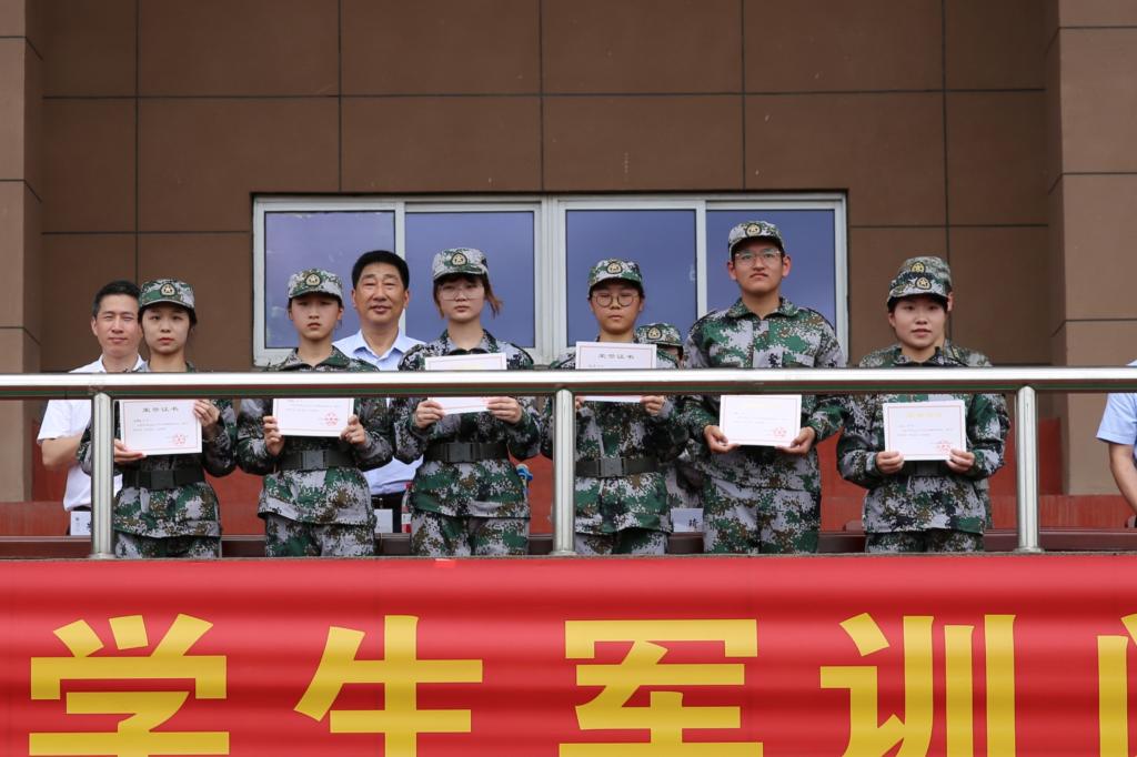 会上,张琦代表学校向教官派出单位代表——平湖市人武部赠送锦旗和一架空警-500预警机模型。朱素斌宣读军训优秀教官、优胜单位、优秀学员名单、军歌大合唱获奖单位。与会领导为受到表彰的优秀教官、军训优胜单位及各连军训优秀学员代表颁发荣誉证书。