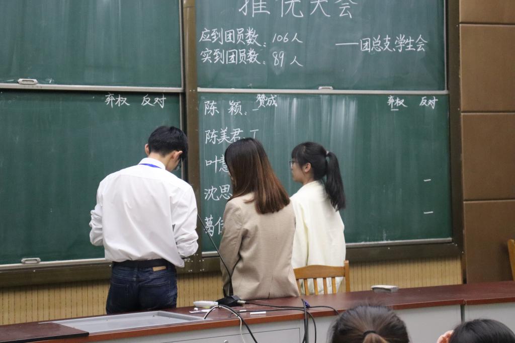 会议伊始,先由楼雨青同学宣读本次推荐入党积极分子候选人名单,并说明推选流程。其次,候选人依次上台发言,介绍个人事迹、阐述学习和工作情况、表明入党决心并总结自身不足。最后,由原师范学院学生党员之家发放选票,采取无记名投票的方式推选。经过公平、公正、公开的投票、监票、唱票和计票环节,张慧婕等八位候选人的票数均过半,均可推荐为入党积极分子进行培养考察。此次团组织、学生会推优大会在紧张的计票环节后圆满结束。