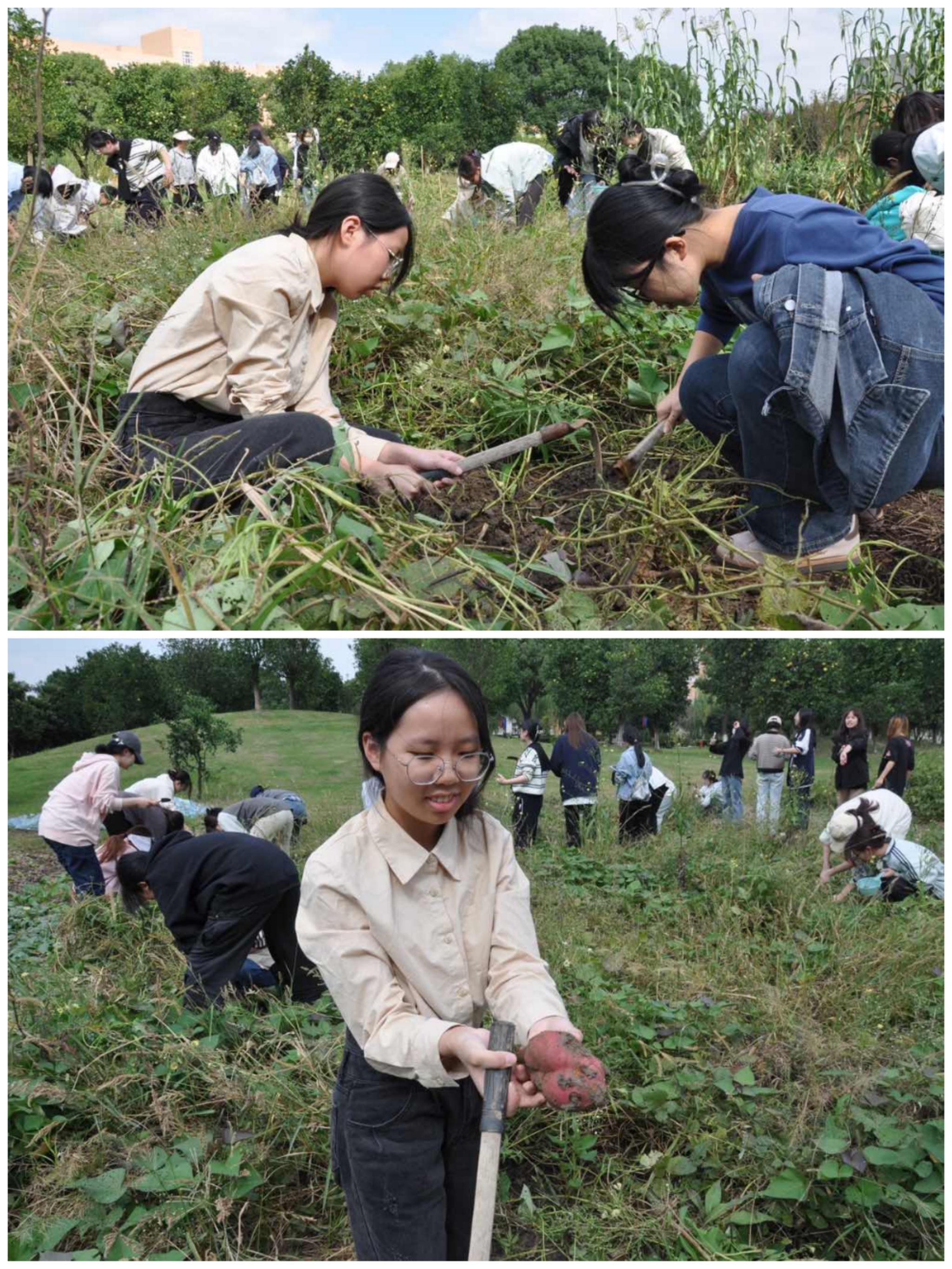 上一学期,学院各班级自行认领一块地,班级全体学生一起参与开垦土地、播撒种子、定期施肥,依据生长状态,及时调整种植方案,所种植物长势喜人。春华秋实,穰穰满家,在此丰收的季节,学生们依次分组,手持镰刀、铲子等工具,率先清除杂草与红薯藤条,而后集中精力投入到挖掘红薯中,形成“挖掘-传递-收集”劳动链,合理分工,提高效率,最终收获了实践的果实与劳动的喜悦。