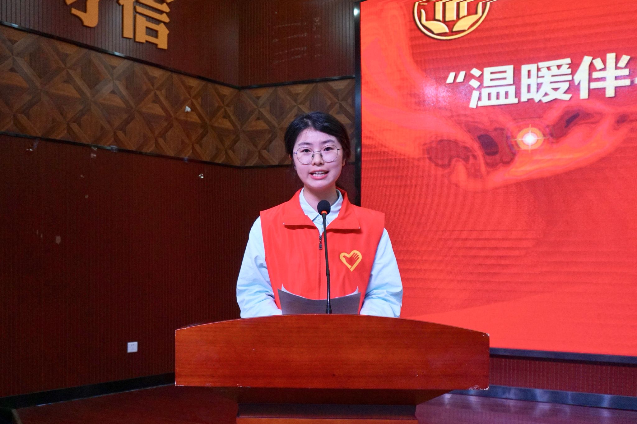 学院志愿者代表陈一涵发言,她代表承诺志愿者们将精准对接学习需求,制定具体辅导方案,用实际行动助力困难家庭儿童、青少年的成长与发展。