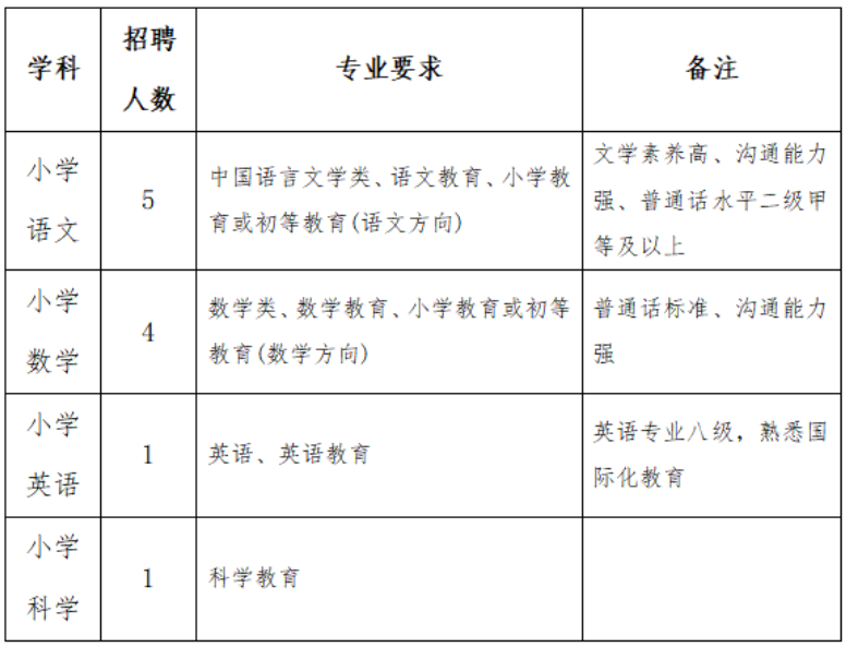 2020年9月,占地86亩的新校区正式投入使用。现有校区2个,班级数近70个,学生近2600名,教职工300余名。为满足学校逐年扩班的教学需要,现面向全国招聘各学科优秀专任教师。具体方案如下: