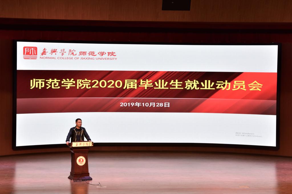 2019年10月28日晚18时30分,2020届毕业生就业动员大会在嘉兴学院平湖校区报告厅顺利举行。师范学院党总支副书记毕洪东老师和学工办辅导员吴凯强老师出席本次会议,2020届三百余名毕业生参加。