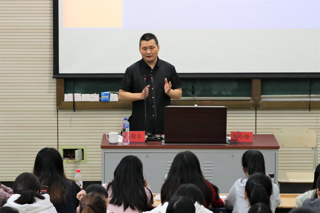 返校活动第一项:校友朱敬东教授《今天是最好的开始——走向新时代发展的素养积淀》讲座在阶梯教室一举行。他根据时代背景和当今政策,具体分析了当今教师行业的现状;并结合自身真实教学经验阐明了人民教师对待自己的职业生涯要具备“勤思辨、敢创新、有自信、担责任”。