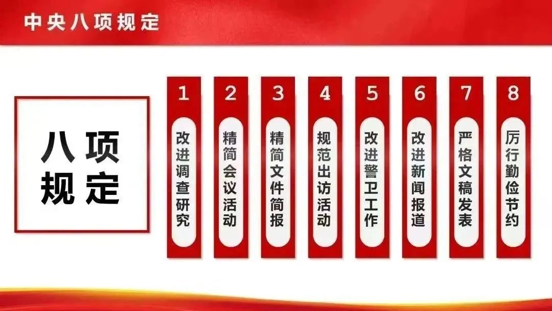 2012年12月4日,习近平总书记主持中央政治局会议,审议通过《十八届中央政治局关于改进工作作风、密切联系群众的八项规定》,从调查研究、会议活动等8个方面为加强作风建设立下规矩: