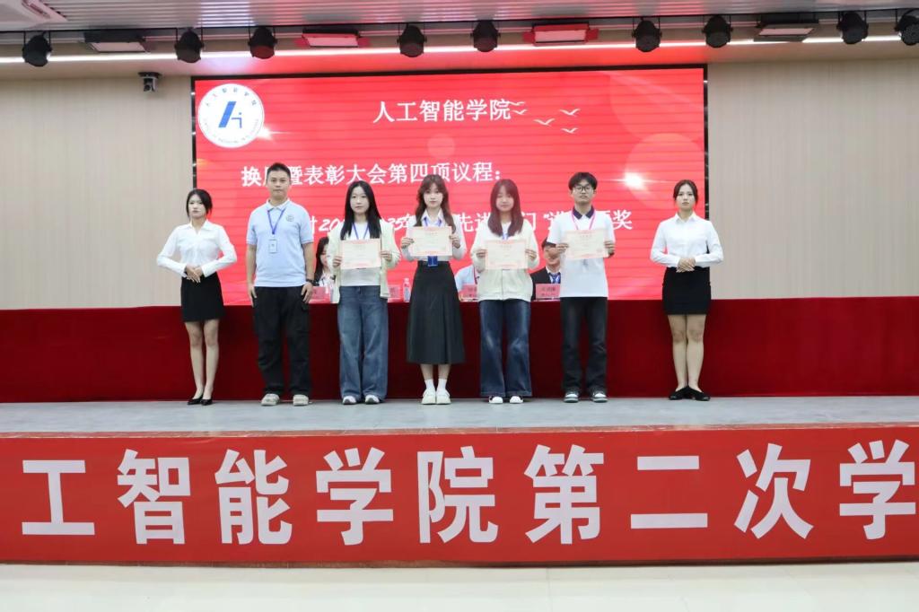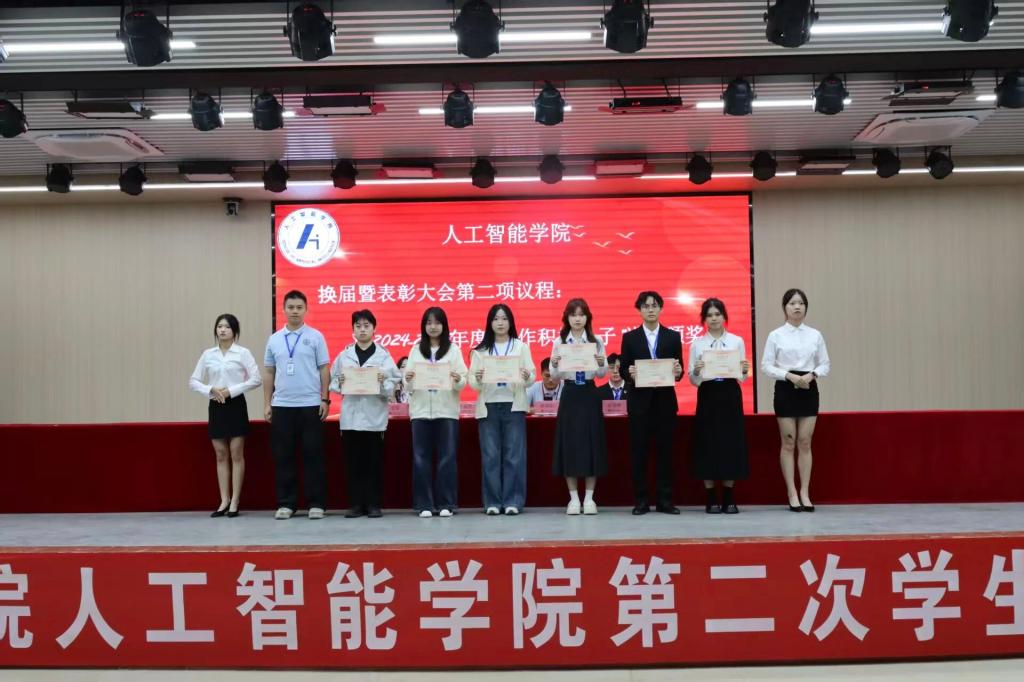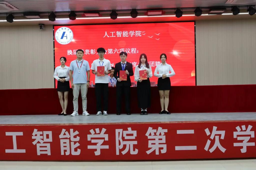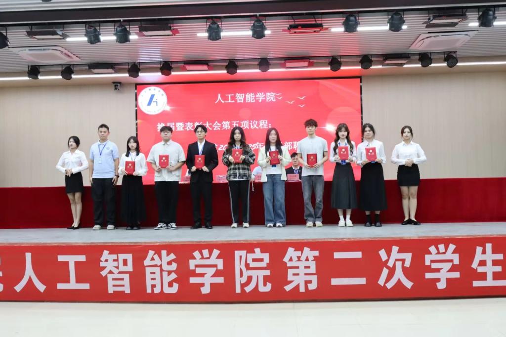 随着第二次学生代表大会的圆满落幕,人工智能学院团总支·学生会随即举行了换届表彰大会。大会表彰了年度优秀个人和团队,团总支书记黎鑫然宣读2024-2025年度表彰名单。大会依次为2024-2025年度学生会干部、主席团成员颁发聘书,充分肯定了他们在过去一年中的辛勤付出与卓越贡献。