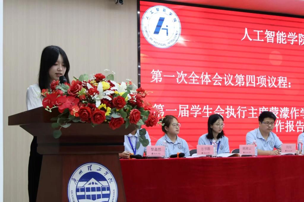 校学生会执行主席吴诗琳宣读校学生会批复。校学生会同意召开大会,同意广州理工学院人工智能学院学生会提出的会议主要任务、议程、代表资格条件、名额分配及产生办法,对主席团候选人名单予以批准,并指出于会议结束后及时将会议情况及选举结果上报广州理工学院人工智能学院学生会秘书处。