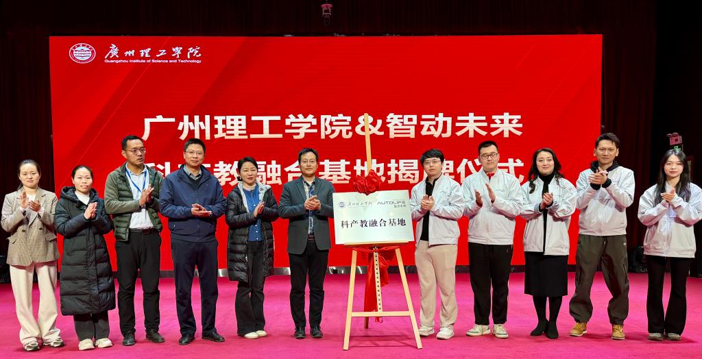 在全场嘉宾见证下,双方代表共同为“广州理工学院人工智能学院智能机器人科产教融合基地”揭牌。