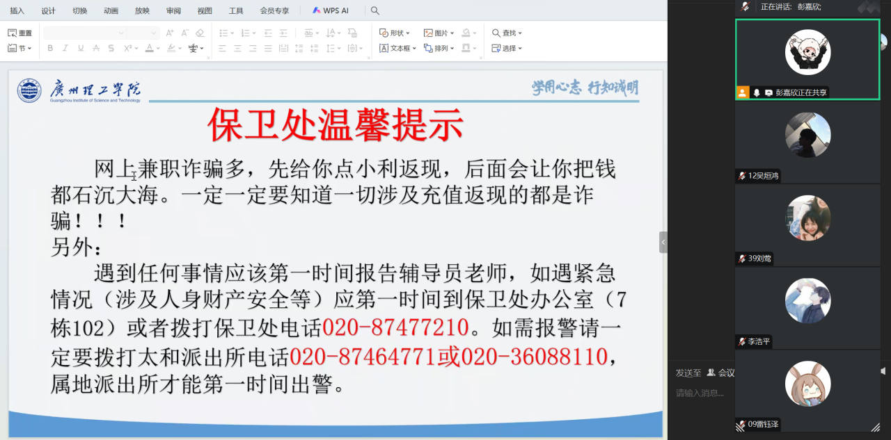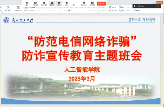 为提升学生防诈能力,筑牢校园安全防线,3月9日晚,人工智能学院通过线上的方式开展预防电信诈骗主题班会,我院全体同学积极参与,共同学习防诈知识。