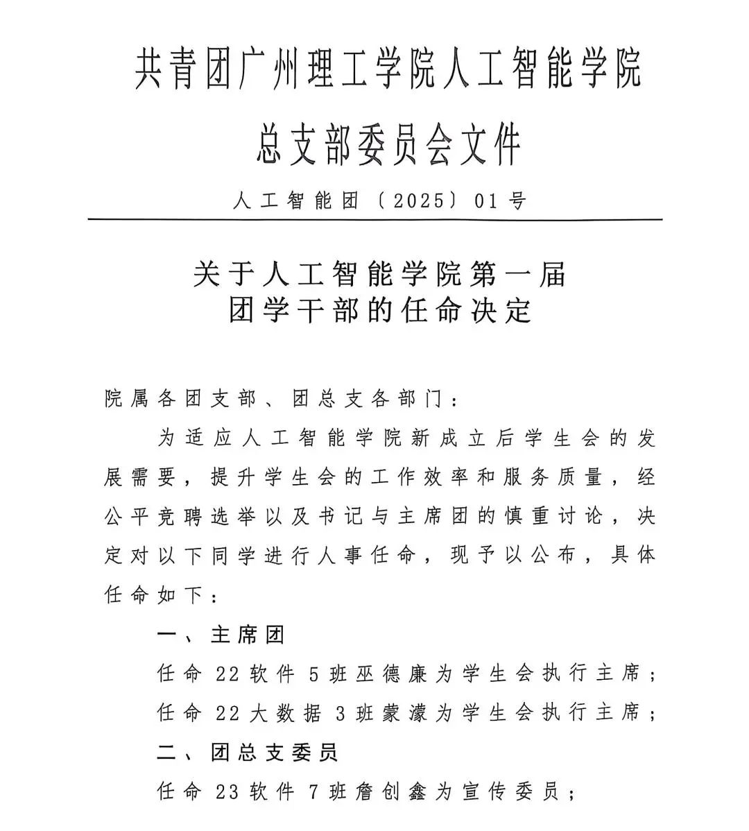 随着人工智能学院的成立,第一届团总支·学生会正式扬帆起航!这是一个崭新的起点,更是青春力量的汇聚,来自软件工程、数据科学与大数据技术和人工智能专业的优秀学子,将共同书写团学工作的新篇章,为学院发展注入蓬勃活力。