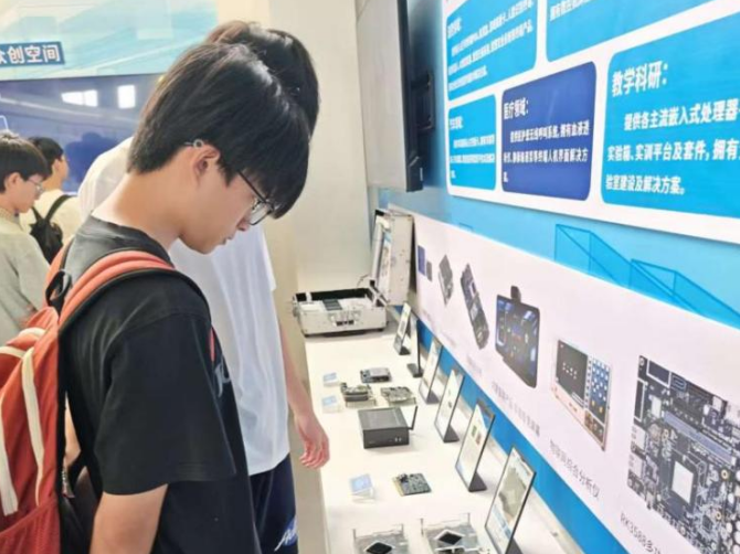 随后,同学们来到了企业产品展示区。在这里,他们参观了专利墙、项目案例展及校企合作成果展示,感受到了粤嵌公司在嵌入式系统、物联网、人工智能等领域的多年技术沉淀。工作人员详细介绍了这些产品的技术特性、实际应用场景及发展趋势,同学们听得津津有味,不时提出自己的见解和疑问。现场互动频繁,气氛热烈。