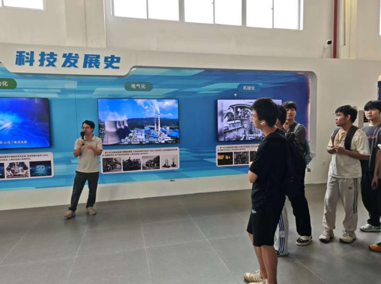 在粤嵌公司“科技发展史”展厅,一场跨越三个世纪的科技对话正在展开。背景墙上,“机械化”“电气化”“数字化”三大主题板块以时间轴形式铺展,配合解说视频重现了ENIAC计算机等里程碑式设备。粤嵌公司讲解员远手持激光笔,正以“从齿轮到代码:软件如何重塑世界”为题,为学生们拆解工业革命到数字革命的底层逻辑。