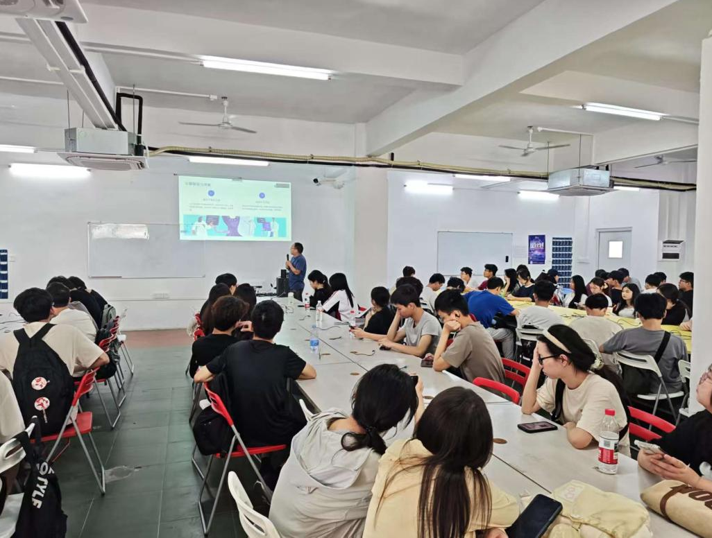 参观结束后,粤嵌科技资深高级工程师大飞为同学们带来了一场精彩纷呈的报告会。会议以“人工智能+AI+JAVA 技术分享与就业指南”为主题,内容从人工智能的发展历程开始,到Java+AI的应用的场景,通过智能问答、智能医疗等领域的实际案例,分享了技术落地的实践经验。此外,他还深入剖析了行业前沿技术趋势,为学生们在专业学习提供了明确的方向指引。