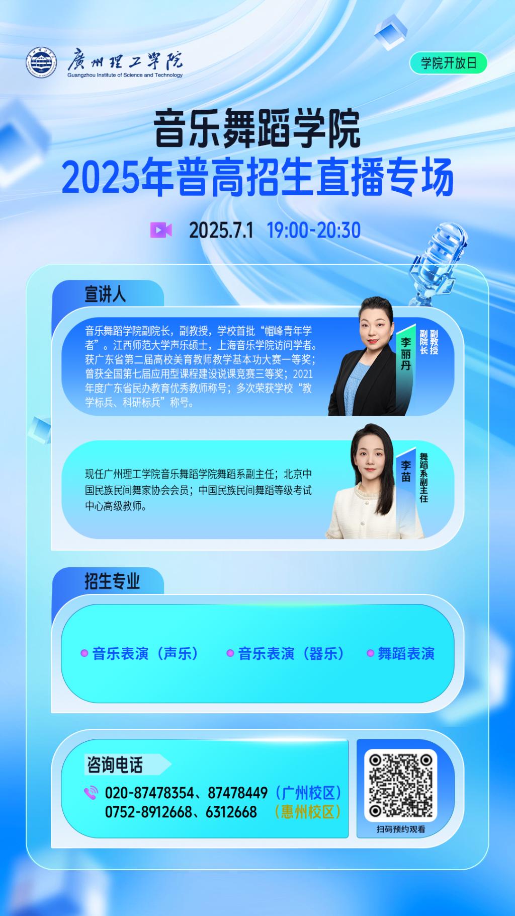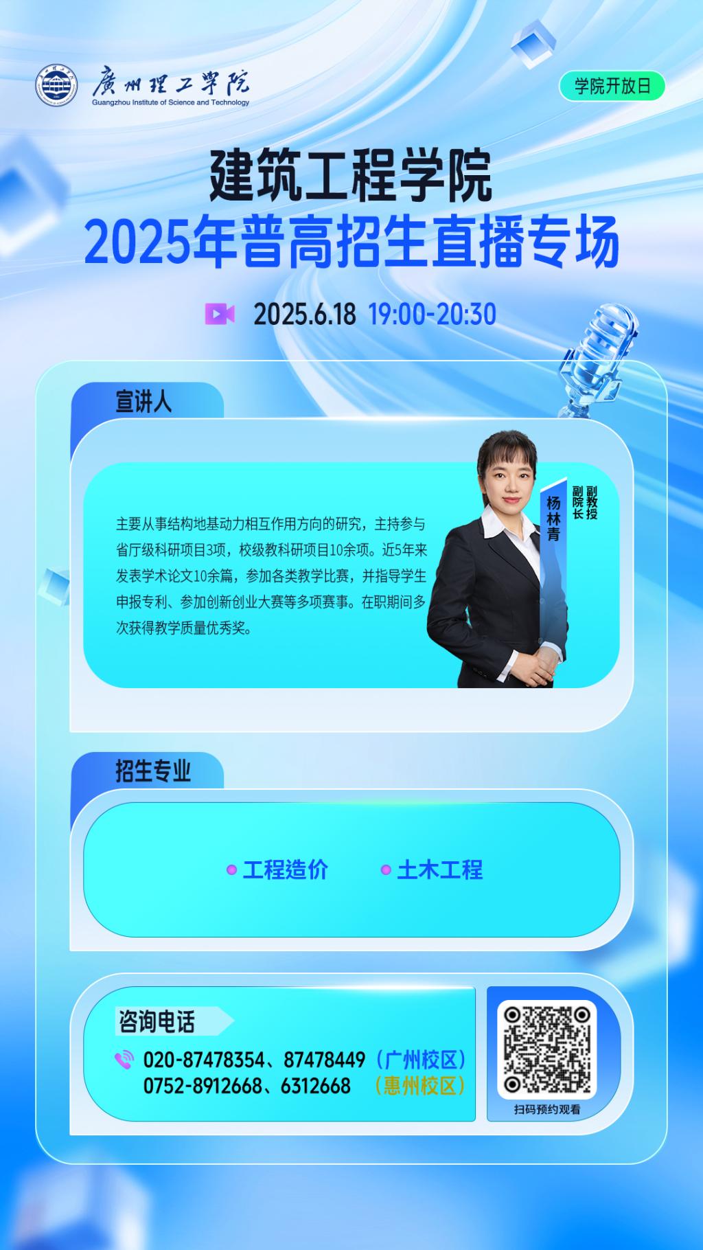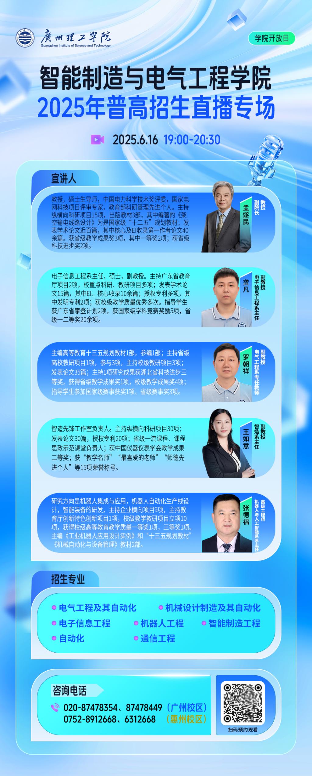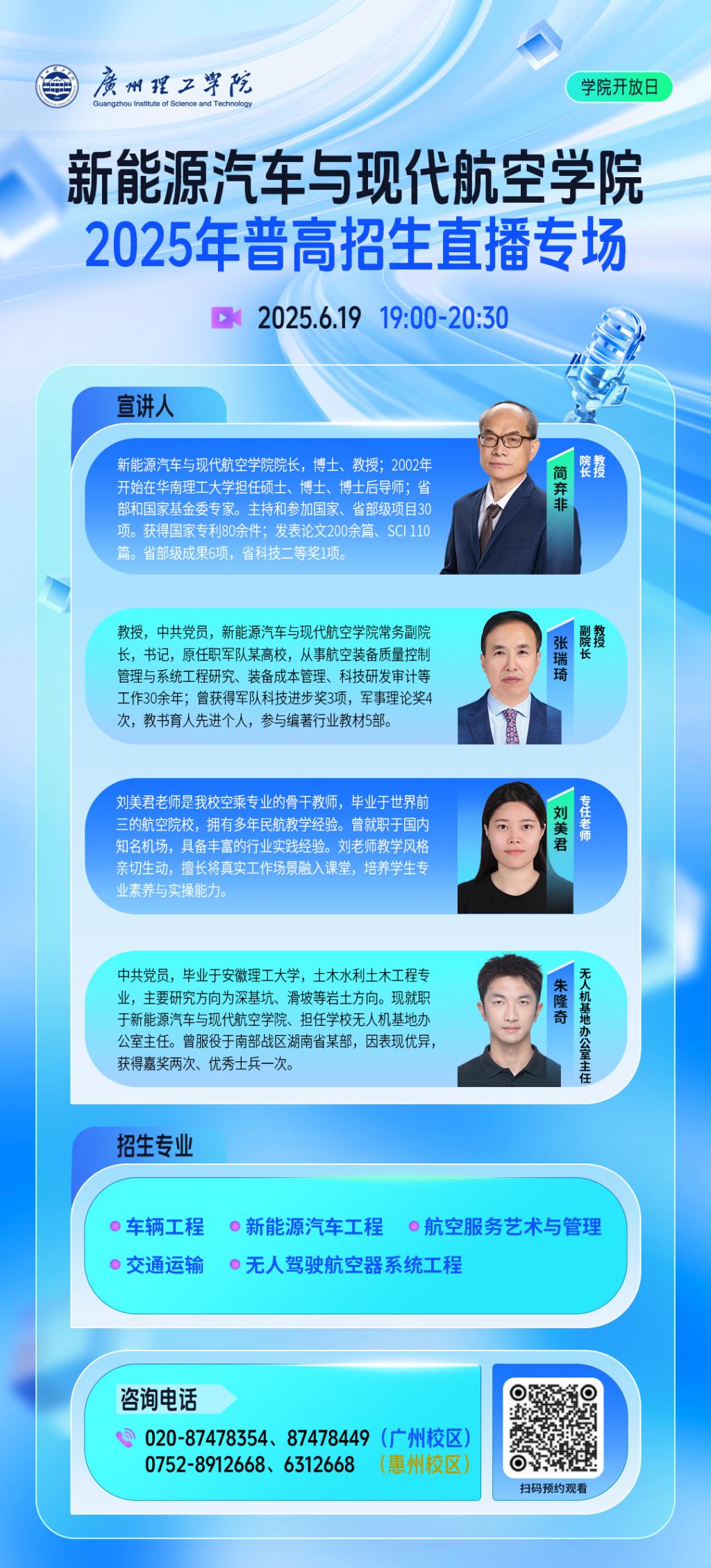 为助力广大考生及家长熟悉广州理工学院,我校将于6月16日-7月2日,开启普通本科招生线上直播季!共计15场直播!,学院开放日与招办面对面双线并行,白天招办权威解读政策,夜间学院深度探秘专业,我们邀请了各学院院长、系主任,工作室负责人以及我校优秀学子等,面对面为您解读专业特色、师资力量、培养方向、 招生政策、就业前景、考研升学、国际交流、学科竞赛,干货满满不容错过!每场可能会有特邀嘉宾出现,带来不一样的惊喜,届时宣宣将同步直播,快来扫码锁定直播间,与名师学霸云端相约吧!
