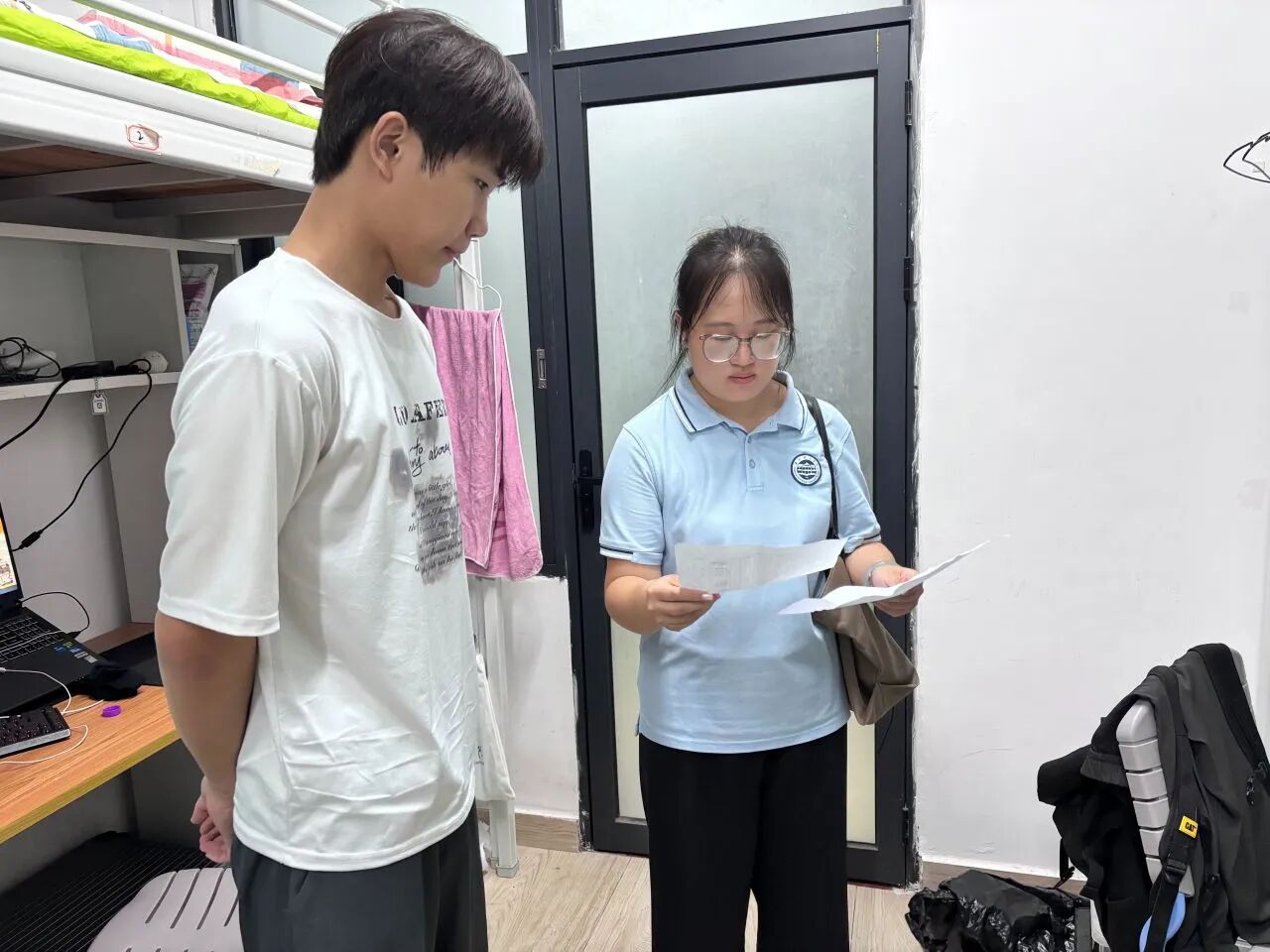 迎新工作告一段落后,辅导员与助理班主任们还一同走访了24级回迁学生的宿舍。每到一间宿舍,他们都与学生亲切交流,仔细查看宿舍的设施配备情况,询问学生对新宿舍的适应程度,叮嘱大家在新环境中要注意安全、和睦相处,同时鼓励学生们尽快调整状态,以饱满的精神迎接广州校区的学习生活。