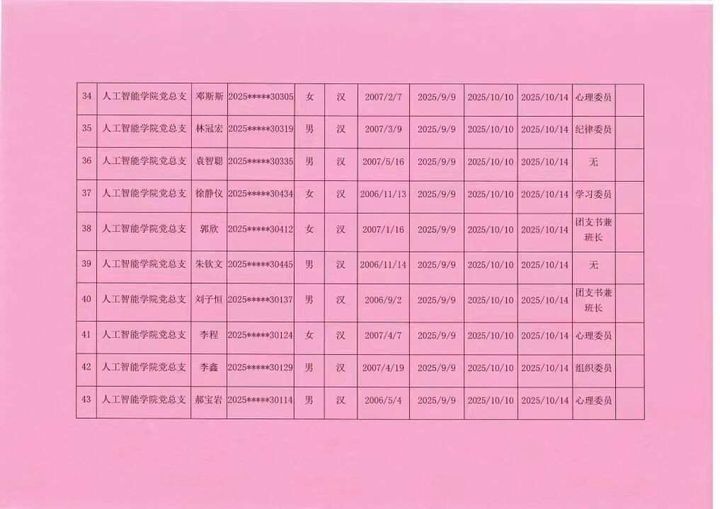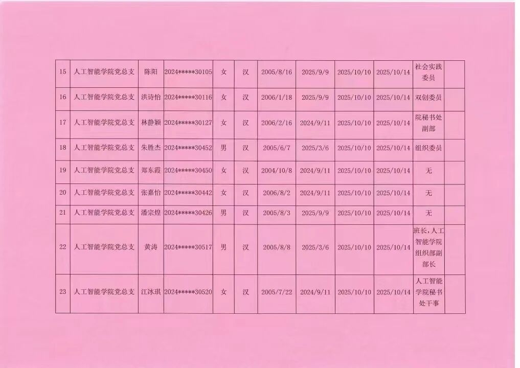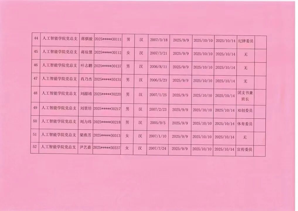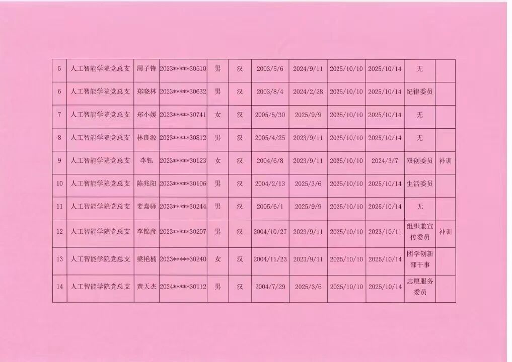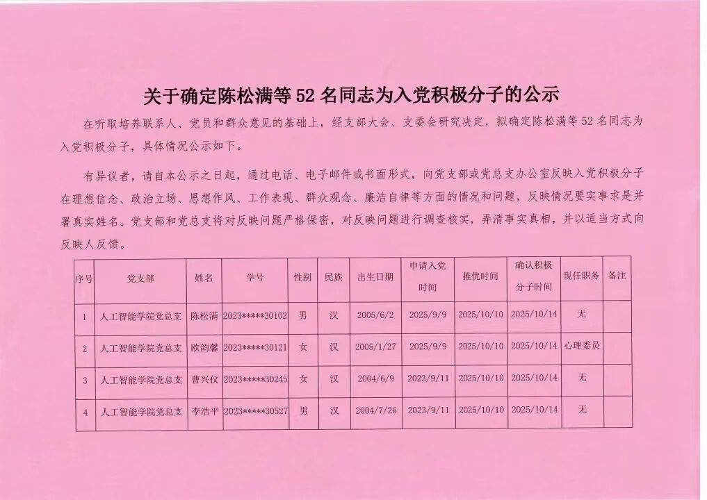 人工智能学院2025年秋季学期入党积极分子公示