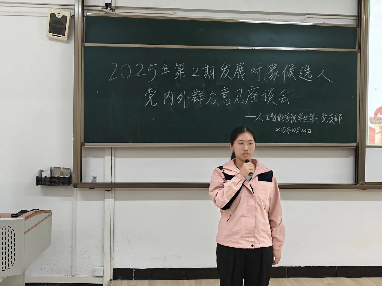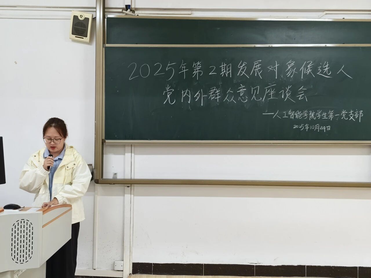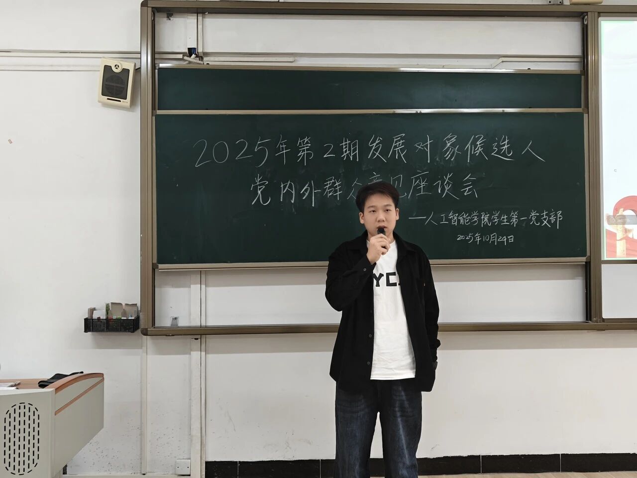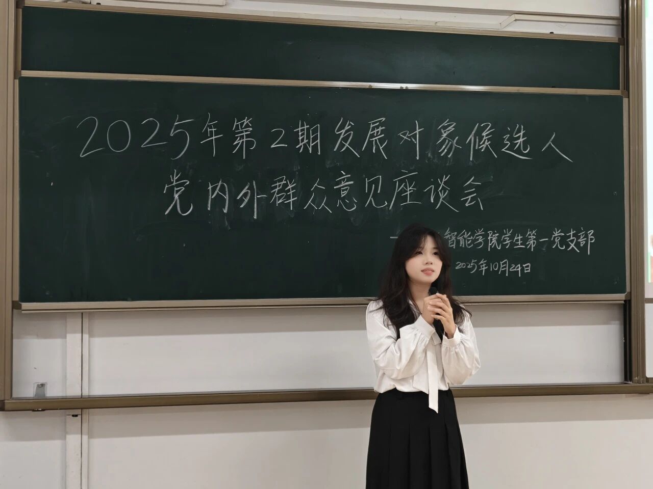 10月24日下午,人工智能学院学生第一党支部于6栋214教室召开2025年第2期发展对象候选人党内外群众意见座谈会。全体党员、发展对象候选人和学生党支部工作人员准时参会。会议开始,主持人详细介绍了会议流程及座谈会的目的和意义。随后,发展对象候选人逐一登台,围绕思想提升、学业进展、实践经历等方面展开汇报,着重说明自身入党动机、对党的认识以及服务群众的具体做法。
