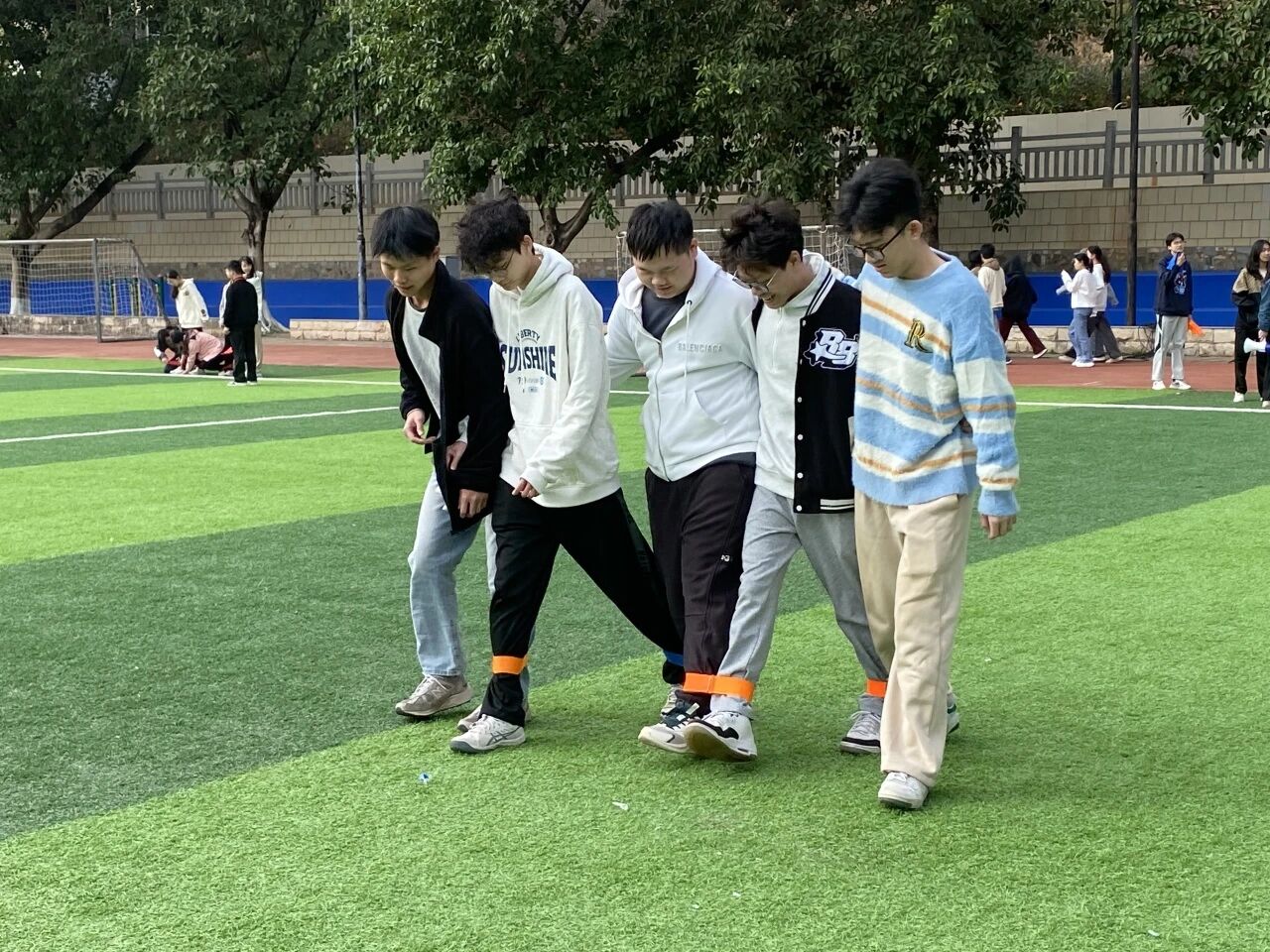 绑紧绑带,喊响口号,让青春的节奏在脚踝共振!五人六足不仅是速度与平衡的较量,更是默契、信任与团队协作的终极试炼!11月20日上午九点半,备受瞩目的五人六足决赛在绿茵足球场热力开锣,掌声、呐喊、秋风与阳光交织,见证并肩冲刺的高燃瞬间!