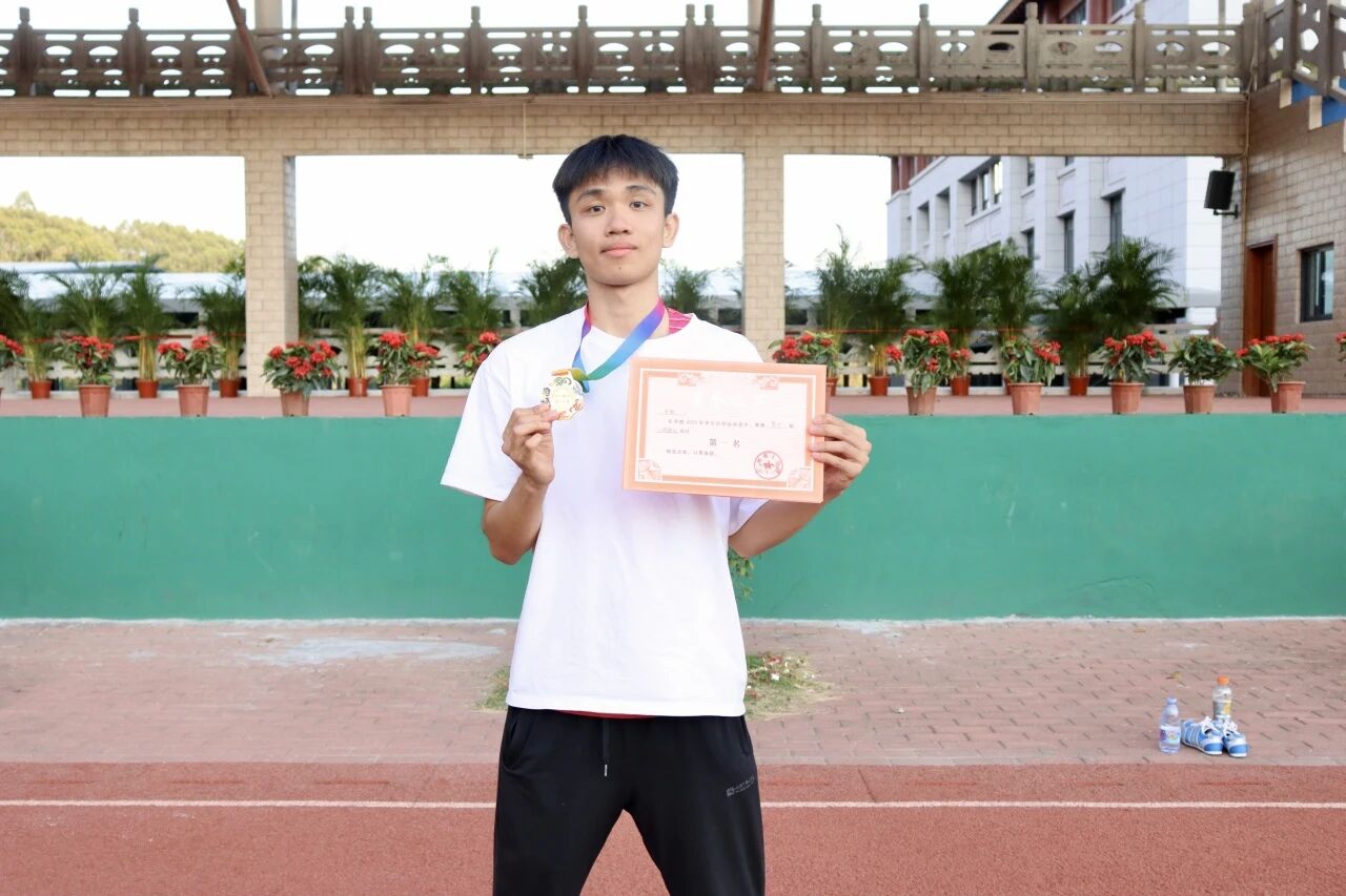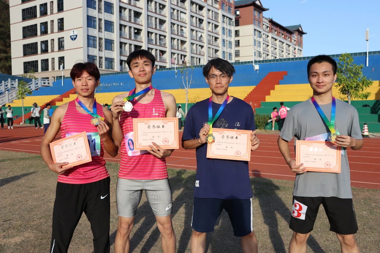 秋场男子4×400米的赛道上,张高明、冯裕、吴烜鸿、林雨达四人冲冠:枪响,一棒箭出弯道;二棒接棒展步;三棒直道扬尘,四棒终棒破风冲线。掌心跳动,是晨练的默契,是并肩的荣光。