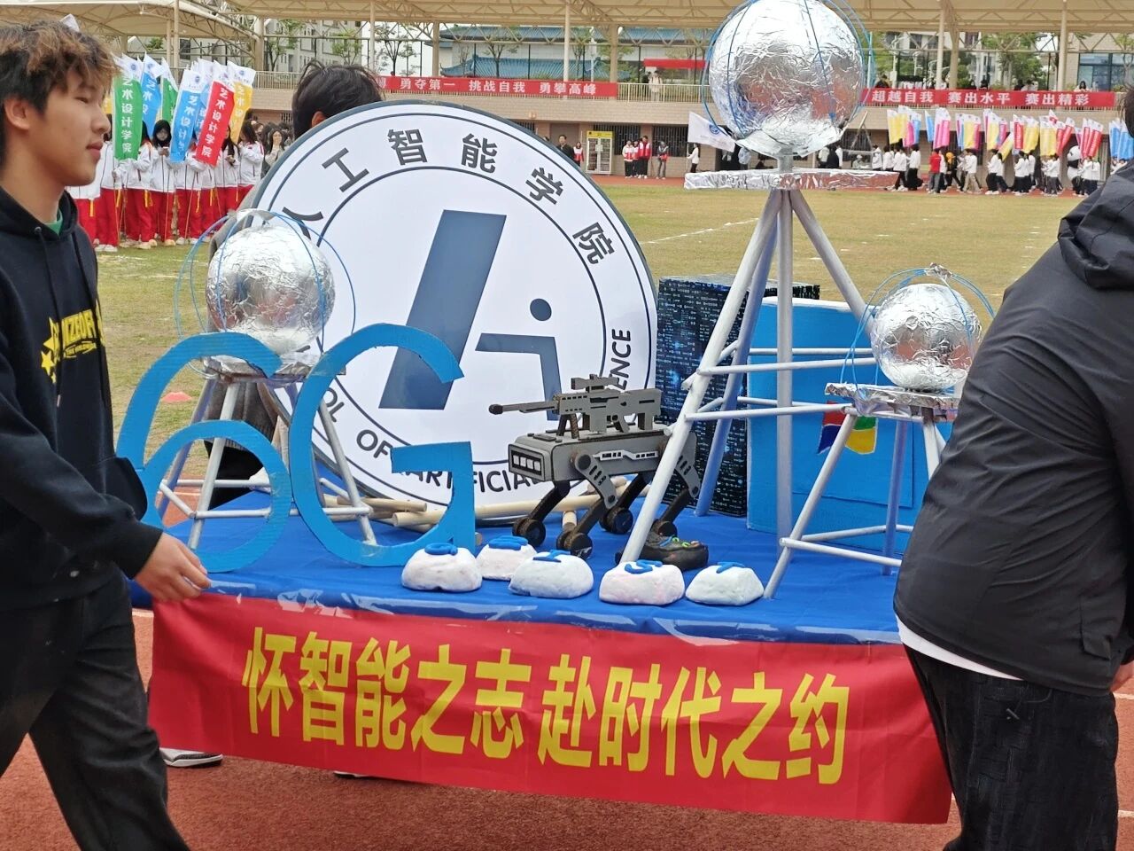 院车乃人工智能学院之核心标识,于校运盛会中彰显非凡象征意义。我院院车设计上深度融入电脑、信号塔、机器狗等专属科技元素,直观凸显学科特色与醇厚学术底蕴;甄选极具未来感的科技配色强化辨识度,既传递学术科研与科技创新的磅礴活力,更呼应昂扬向上的运动风尚与校园文化气象。