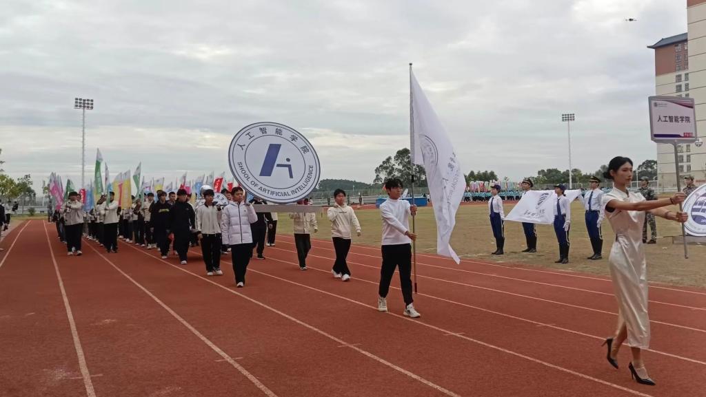 激昂的运动员进行曲奏响,我院方阵身着整齐着装,精神昂扬、昂首阔步,迈着矫健步伐走过主席台。“ 彩旗高扬,AI 领航,赛场逐梦,勇创辉煌”的口号铿锵有力、响彻赛场,尽显团结奋进、锐意进取的青春风采。