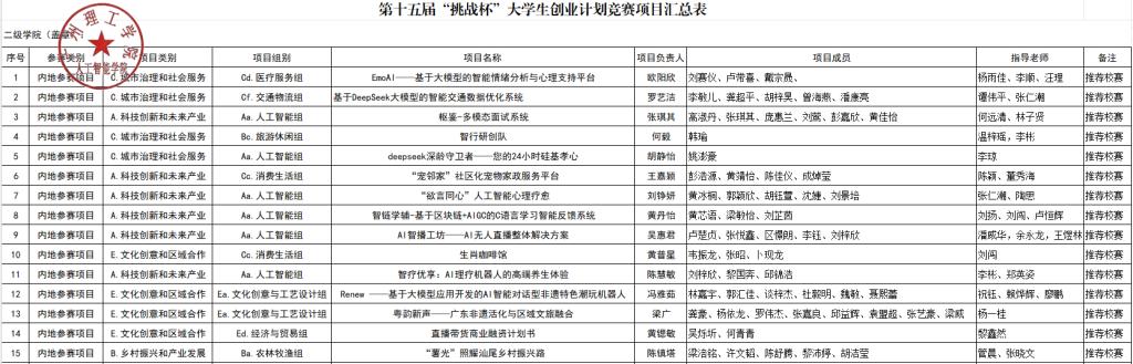 根据《关于举办第十五届“挑战杯”广东大学生创业计划竞赛校内选拔赛的通知》相关要求,人工智能学院积极组织学生参与,各班级踊跃上交申报作品。经过组织初审——班赛推优——学院评审等环节,选拔出以下作品推荐参加校赛。现将推荐参加校赛作品名单及相关信息进行公示。
