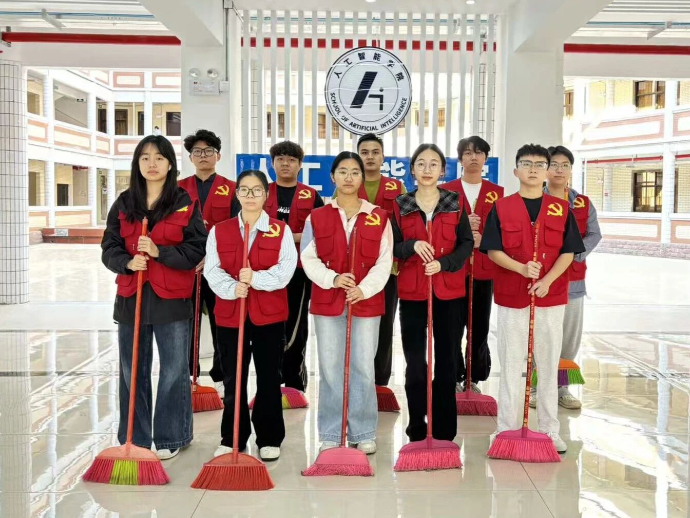 近日,人工智能学院学生党支部组织多名学生志愿者于四号、五号教学楼开展爱国卫生运动。志愿者们通过清洁走廊等实践活动,将党的二十届四中全会精神转化为服务师生的具体行动。