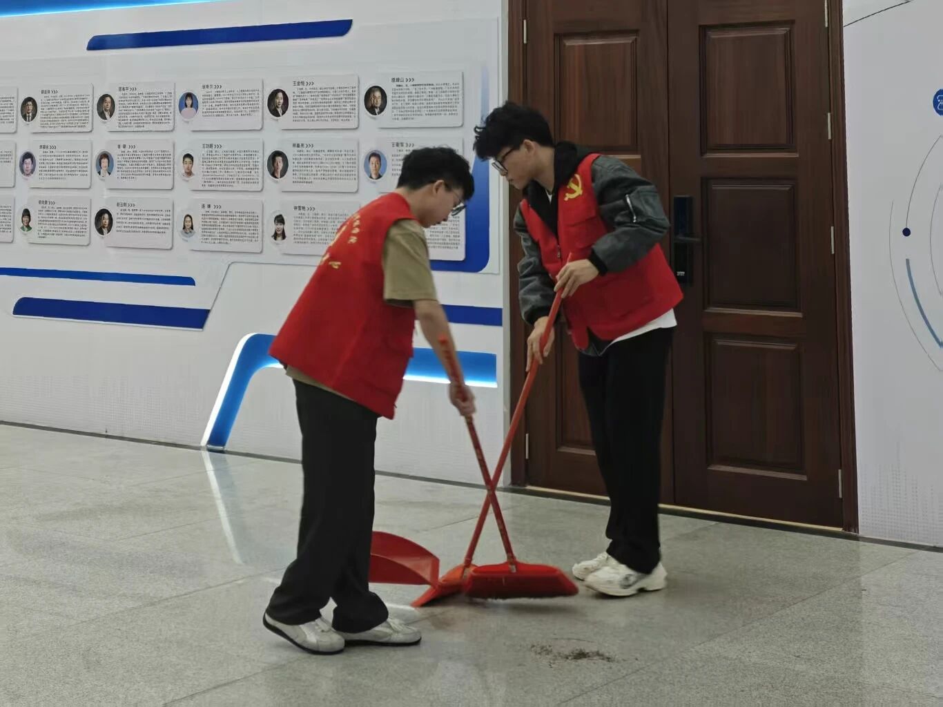 下午,学生志愿者们在教学楼大厅集合,有序领取扫帚、簸箕等清洁工具。