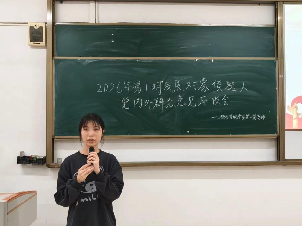 4月2日下午,人工智能学院学生第一党支部于6栋315教室召开2026年第1期发展对象候选人党内外群众意见座谈会。组织员刘闯,学生第一党支部书记方书靓、全体党员、发展对象候选人和党支部工作人员准时参会。