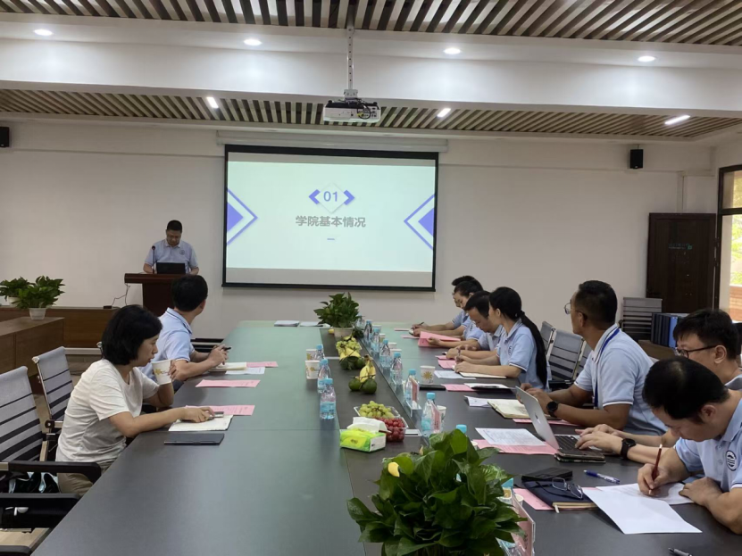 随后,王煜林院长作学院汇报。他围绕学院办学定位与特色、专业建设、课程建设、师资队伍建设、学生发展成效、质量保障体系等方面,系统地汇报了学院取得的成果。陈英征副主任就汇报内容的精心准备给予肯定,也提出了一些建议,比如人才培养目标加上“理论基础扎实”、党建板块加上学生培养成效等。