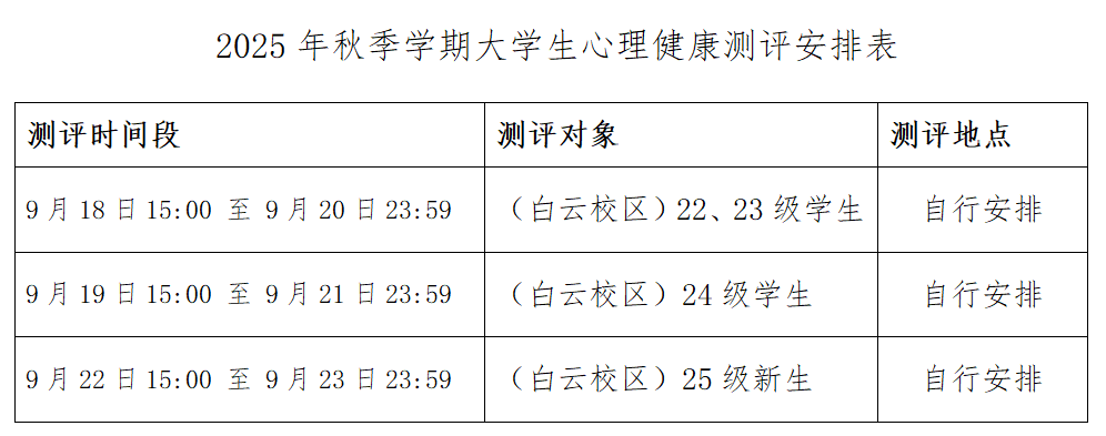 2025年秋季学期大学生(白云校区)心理健康测评安排如下图所示: