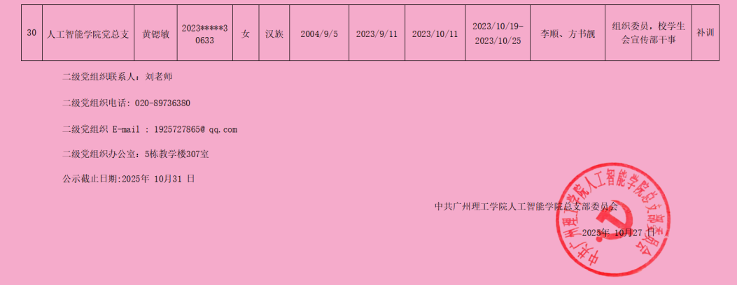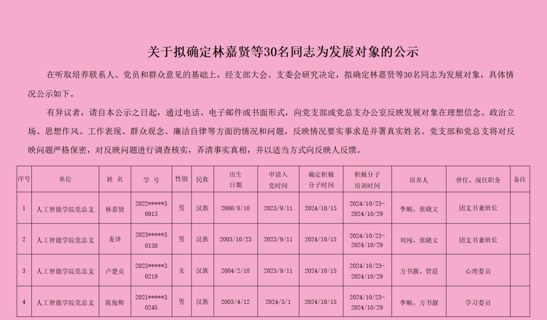 在听取培养联系人、党员和群众意见的基础上,经支部大会、支委会研究决定,拟确定林嘉贤等30名同志为发展对象,具体情况公示如下。