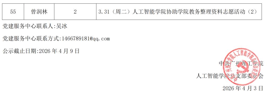 在听取培养联系人、党员和群众意见的基础上,经支委会研究决定,对人工智能学院各个发展阶段的同志进行2026年3月份党建服务时公示,具体情况公示如下。