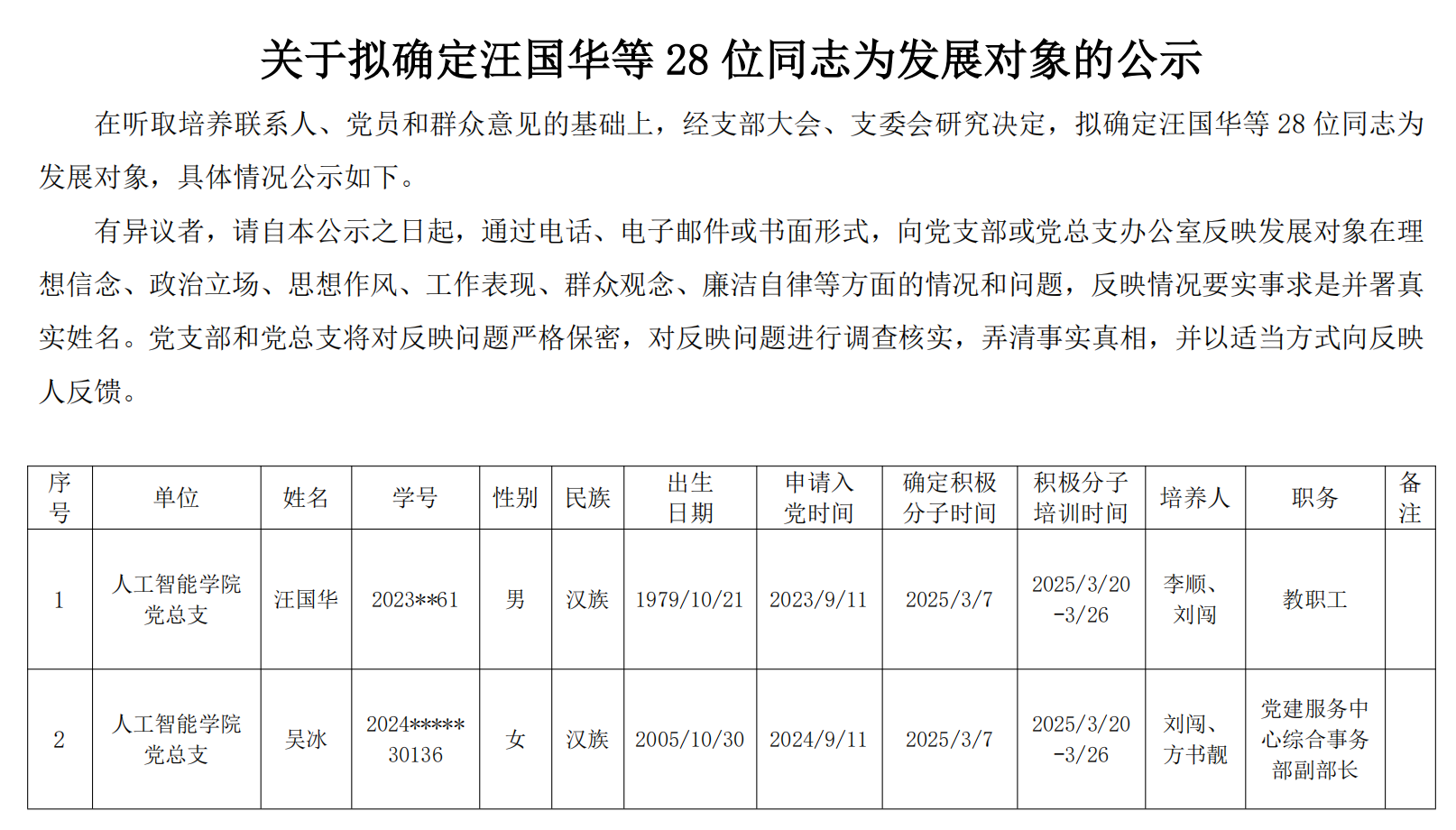 在听取培养联系人、党员和群众意见的基础上,经支部大会、支委会研究决定,拟确定汪国华等28位同志为发展对象,具体情况公示如下。