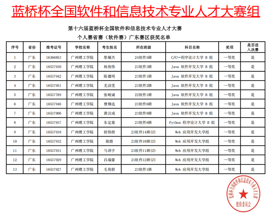在本次省赛中,黎展杰、杨俊伟、陈德明等13位同学凭借扎实的专业基础、突出的实践能力和创新思维,在激烈竞争中脱颖而出,斩获省一等奖,顺利晋级全国总决赛。此外,还有众多同学分别获得省级二等奖和三等奖。这一优异成绩既是学校在软件工程、数据科学与大数据技术、人工智能等专业人才培养成效的集中体现,更是学院长期重视实践教学、积极推动学科竞赛育人成果的生动印证。