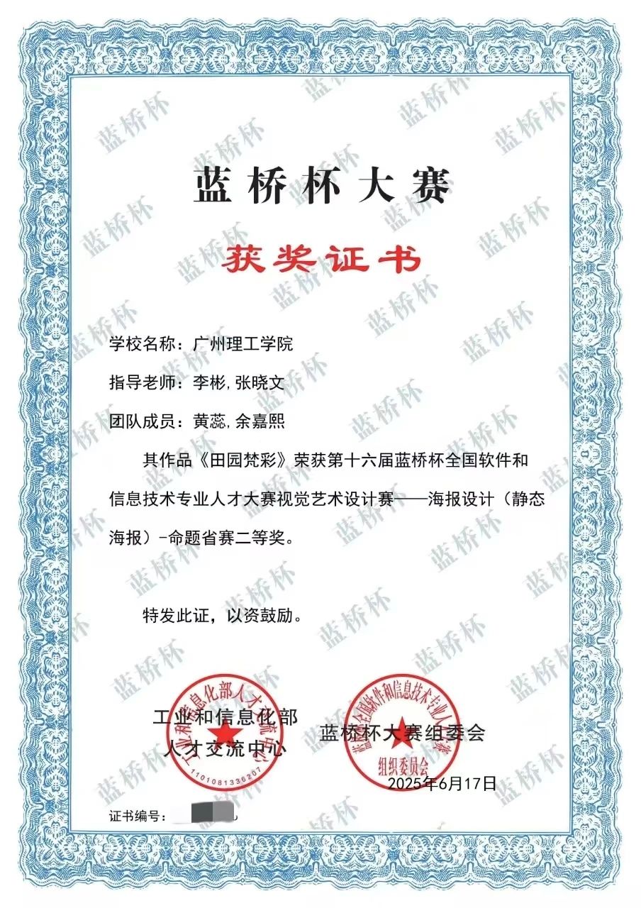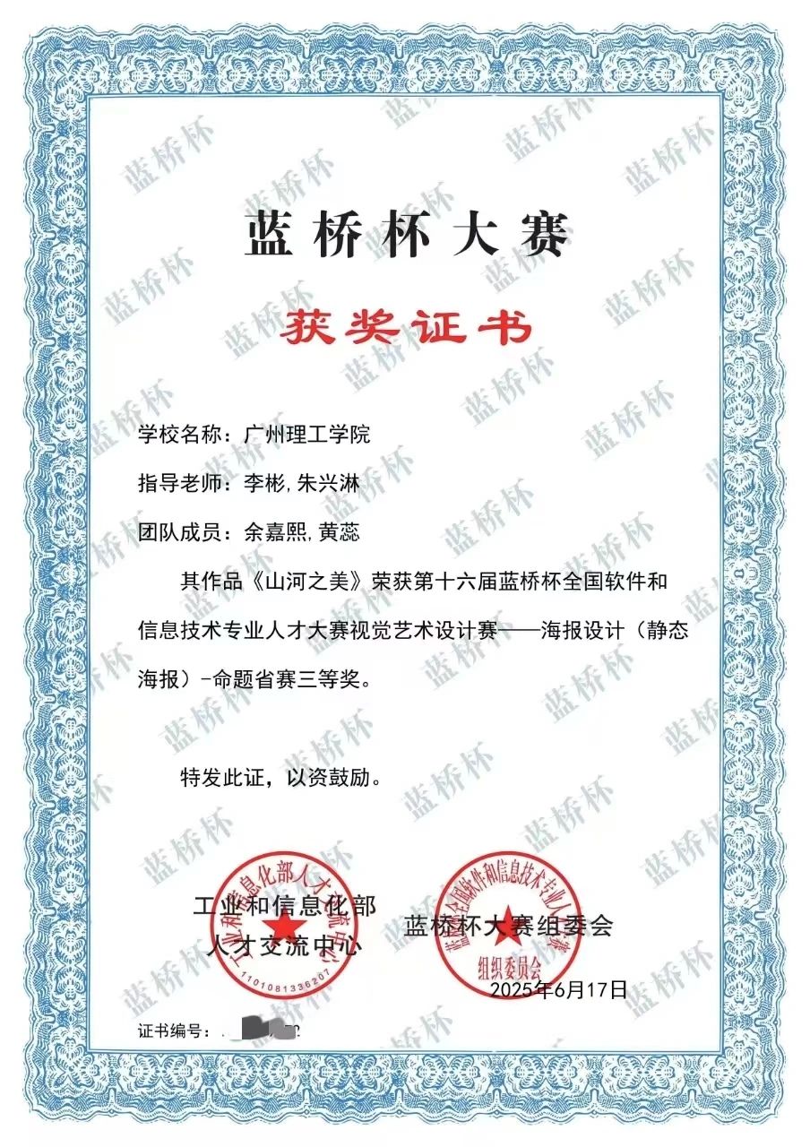 近日,第十六届蓝桥杯全国软件和信息技术专业人才大赛视觉艺术设计赛(海报设计)省级奖项评选结果揭晓。人工智能学院学子表现优异,斩获4项省级奖项。其中,作品《正山茶语》荣获二等奖,《田园梵彩》《山河之美》获三等奖,《匠心风物、雅韵流香》获优秀奖,充分展现了学院在艺术设计与人工智能交叉领域的教学成果。